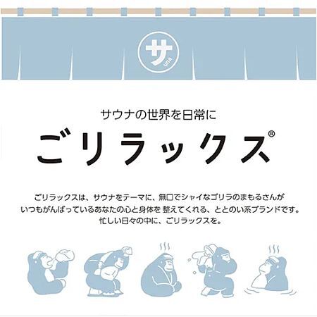 ごリラックスは、サウナをテーマに、無口でシャイなゴリラのまもるさんが、いつもがんばっているあなたの心と身体を整えてくれる、ととのい系ブランドです。